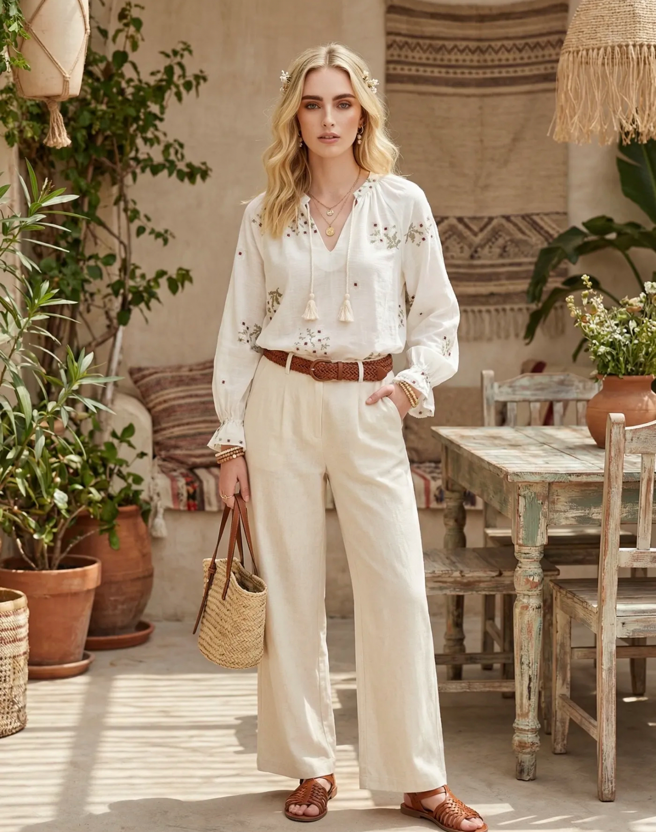 Πουκαμίσα boho εκρού με κεντήματα χακί